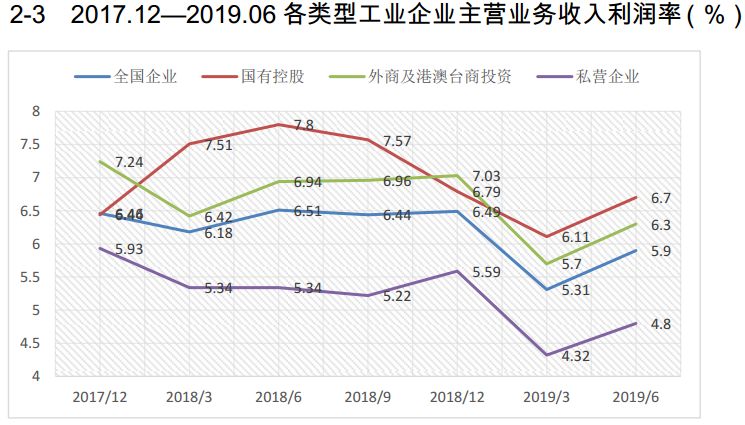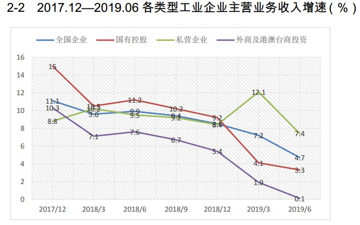 2018年,全国工业、国有控股工业、外资工业与私营工业的主营业务收入分别增长8.5%、9.2%、5.4%和8.4%。